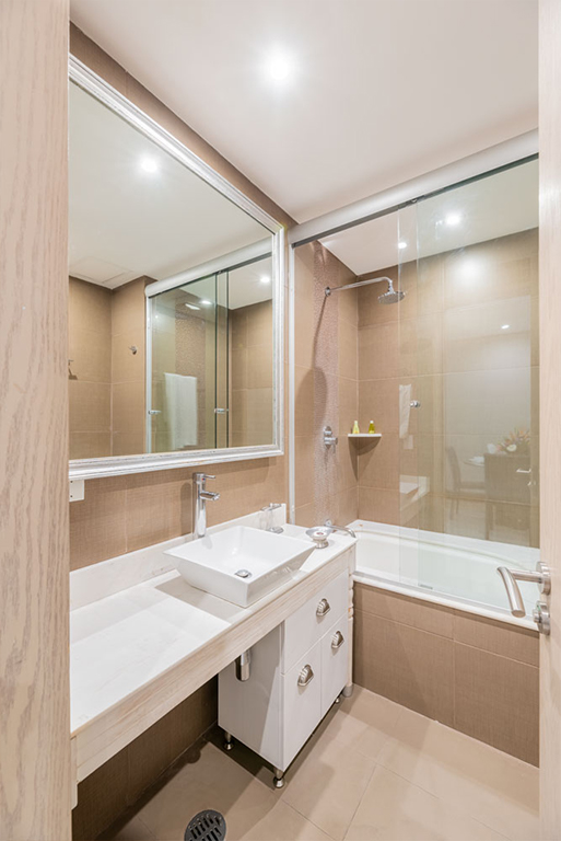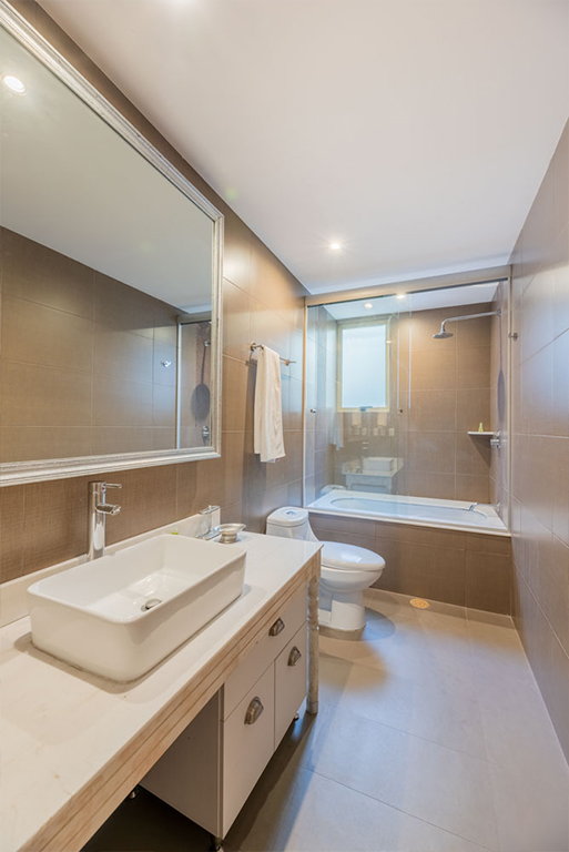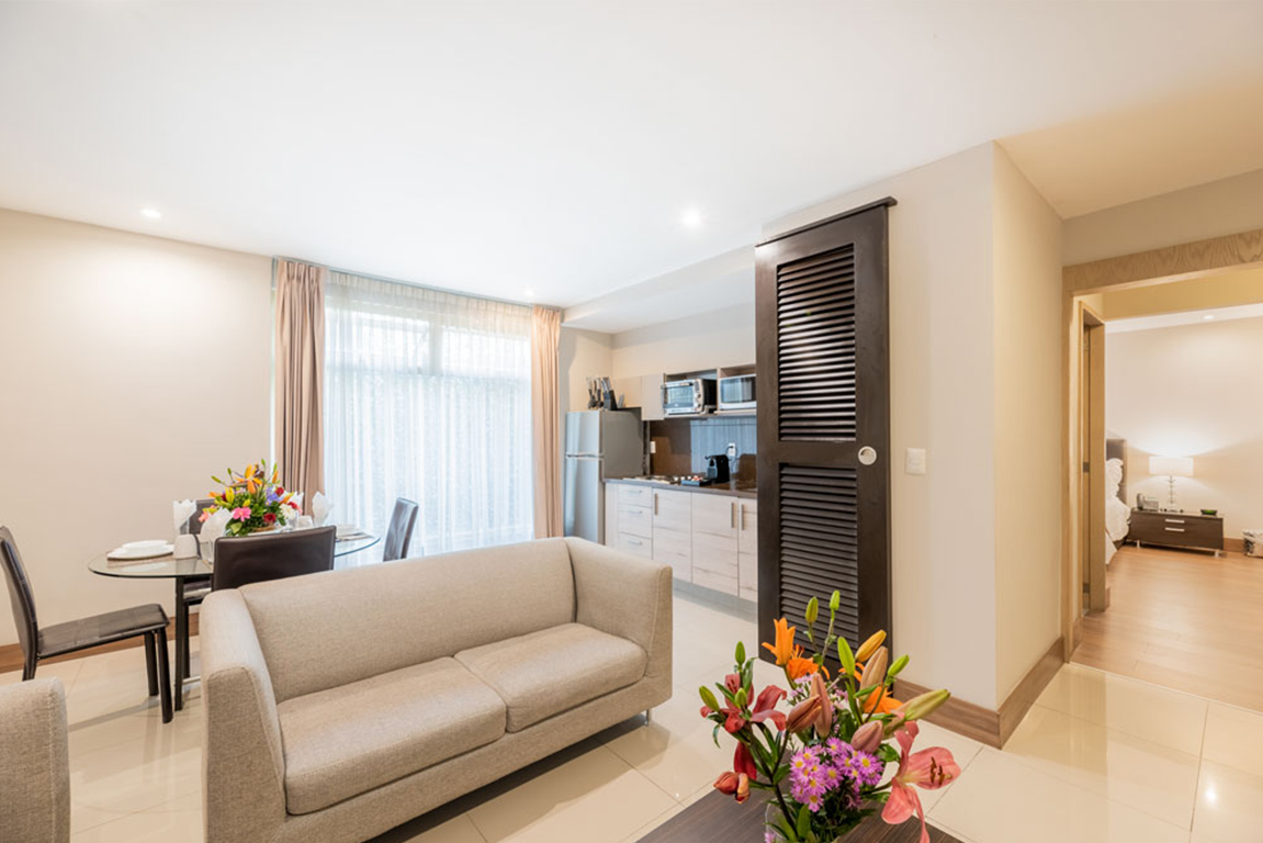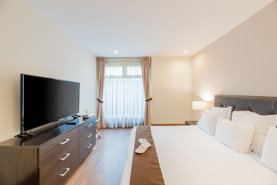 The master bedroom features a king-size bed, TV, speaker, telephone with local service, an en-suite closet, an en-suite bathroom, and a street view. The kitchen is equipped with a stove, refrigerator, coffee maker, dishes, cookware, a Nespresso machine, and other kitchen utensils. There is also a washer and dryer in the apartment.