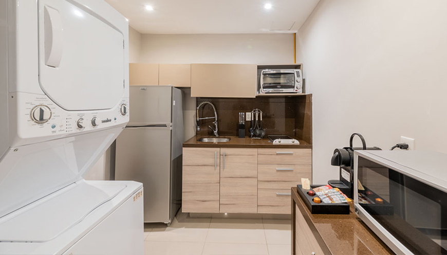The main bedroom has a king size bed, TV, speaker, telephone with active service for local calls and air conditioning and heating system. The kitchen is equipped with stove, refrigerator, coffee maker, dishes, cookware, nespresso coffee maker and other kitchen utensils. There is also a washer / dryer machine in the apartment.